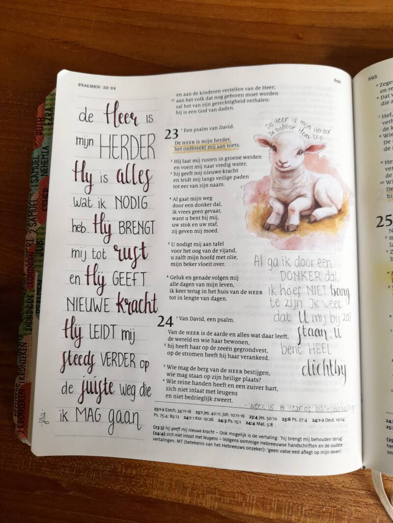 Een goede herder zorgt voor zijn schapen, hij zal er geen één uit het oog verliezen, zal ze beschermen, verzorgen, troosten, aansporen en bemoedigen. Zo zorgt en geeft de Here ook alles wat jij en ik nodig hebben. En daarom kon David dit zeggen. Want de Here was zijn kracht, zijn rust, zijn hoop en het was de Here die hem keer op keer moed en vertrouwen gaf. Uit zichzelf kon hij het niet en vanuit zijn omstandigheden gezien, ontbrak het hem aan van alles. Maar met zijn blik op de Heer gericht, veranderde zijn perspectief. Hij mocht ervaren dat hij steeds kreeg wat nodig was. Ja middenin alle pijn, angst, verdriet en lijden kon David zeggen dat het hem aan niets ontbrak, want Gods liefde en trouw vergezelde hem iedere dag. En Hij voorzag.